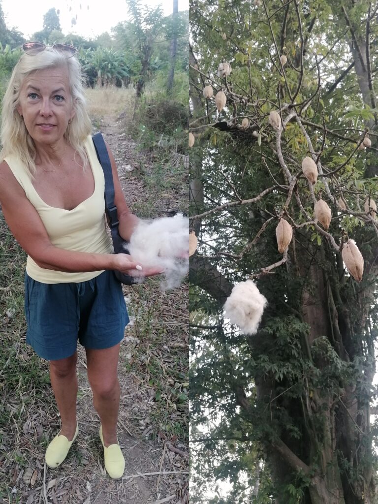 Milzīgs koks ar vates kušķiem. Vikipēdija zināja teikt, ka tas ir kokvilnas koks.