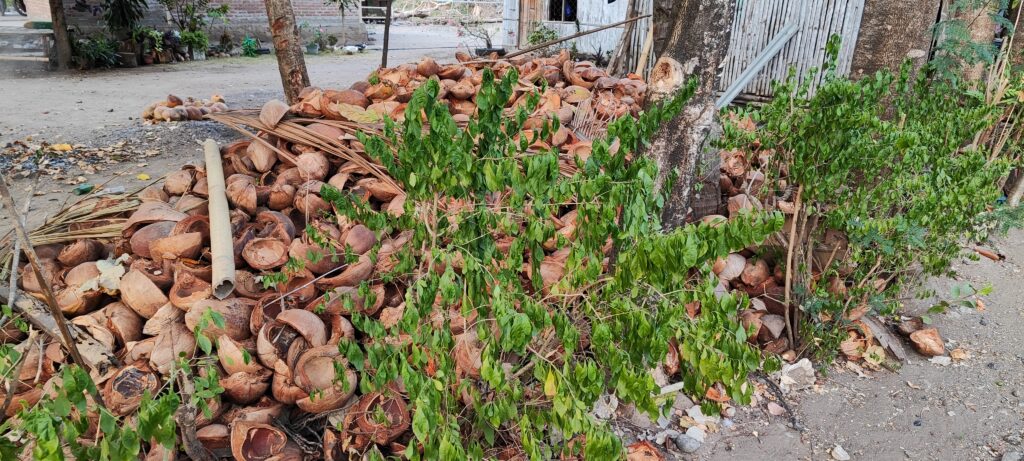 Savdabīgi likās lieli krāvumi no kokosriekstu čaulām. Izrādās, ka tas ir labākais materiāls ēst gatavošanai, gan grillešanai, gan arī citādi ēdiena pagatavošanai. Arī paši vēlāk mielojāmies ar uz kokosriekstu čaulām grillētām zivīm.
