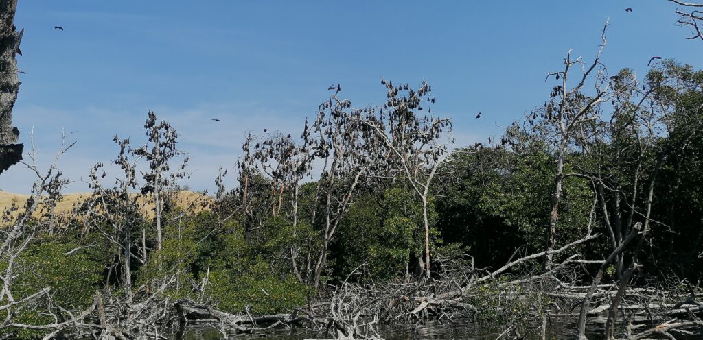 Vispirms braucam apraudzīt milzu sikspārņus (flying foxes), kas dzīvo uz vienas no salām un karājas nokaltušajos kokos. Tā pavisam tuvu tiem netiekam pielaisti, jo droši, ka viņi nevēlas pārlieku cilvēku uzbāzību. Vienalga ir efektīvi, kad virs galvas riņķo sikspārnis ar 2m spārnu izvērsumu.