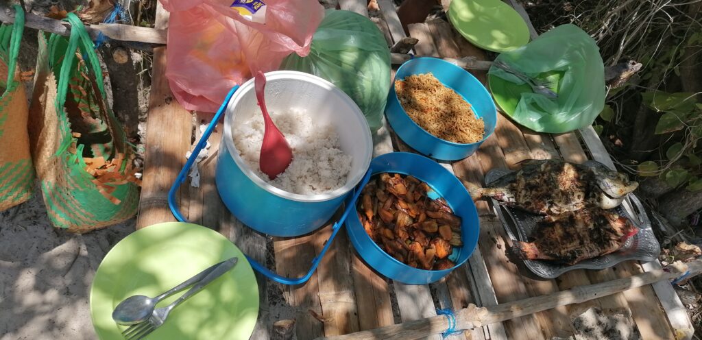 Pusdienas mums tiek gatavotas no tikko ķertām zivīm, kas grillētas uz kokosriekstu čaulu ugunskura.